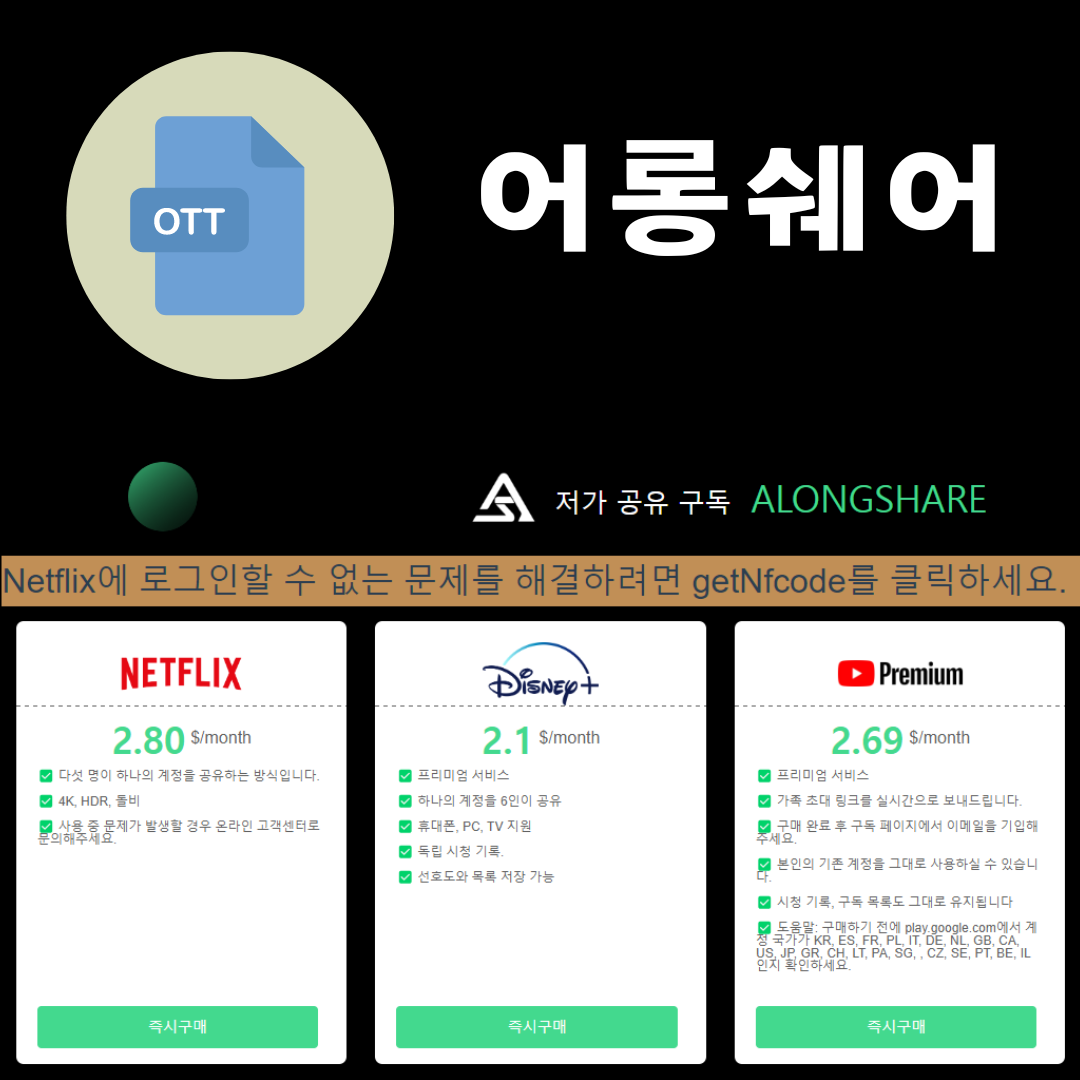 어롱쉐어는 유튜브 프리미엄이나 넷플릭스가 매우 저렴한 편이지만 넷플리스 같은 경우, 14일에 한번씩 인증코드를 입력해야한다는 번거로움이 있다.