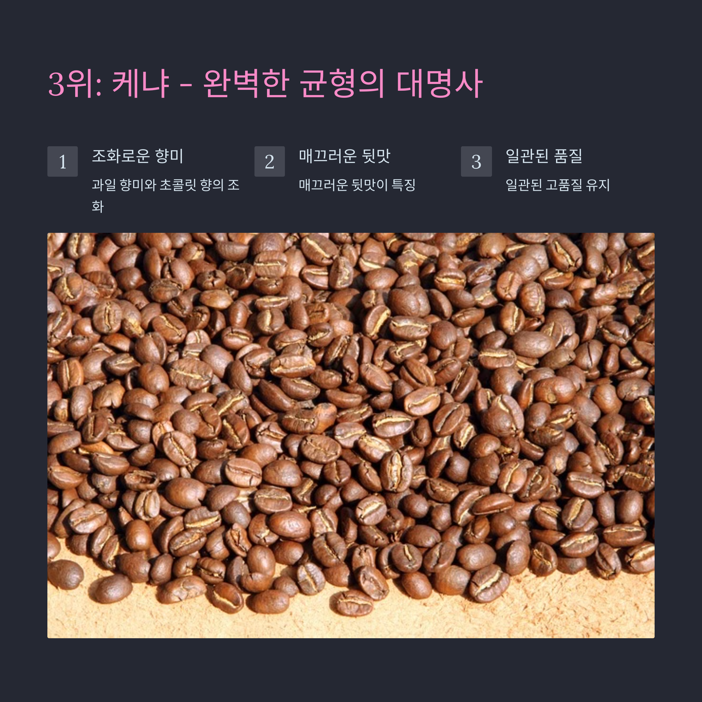 케냐 커피는 그 뛰어난 밸런스로 3위를 차지했습니다.주요 특징: