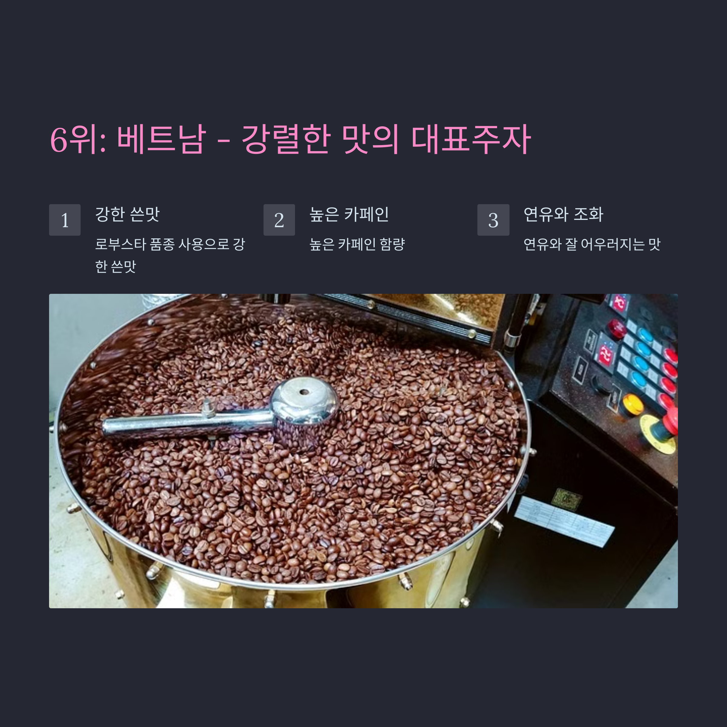 마지막으로, 베트남 커피는 그 독특하고 강렬한 맛으로 6위에 올랐습니다.주요 특징: