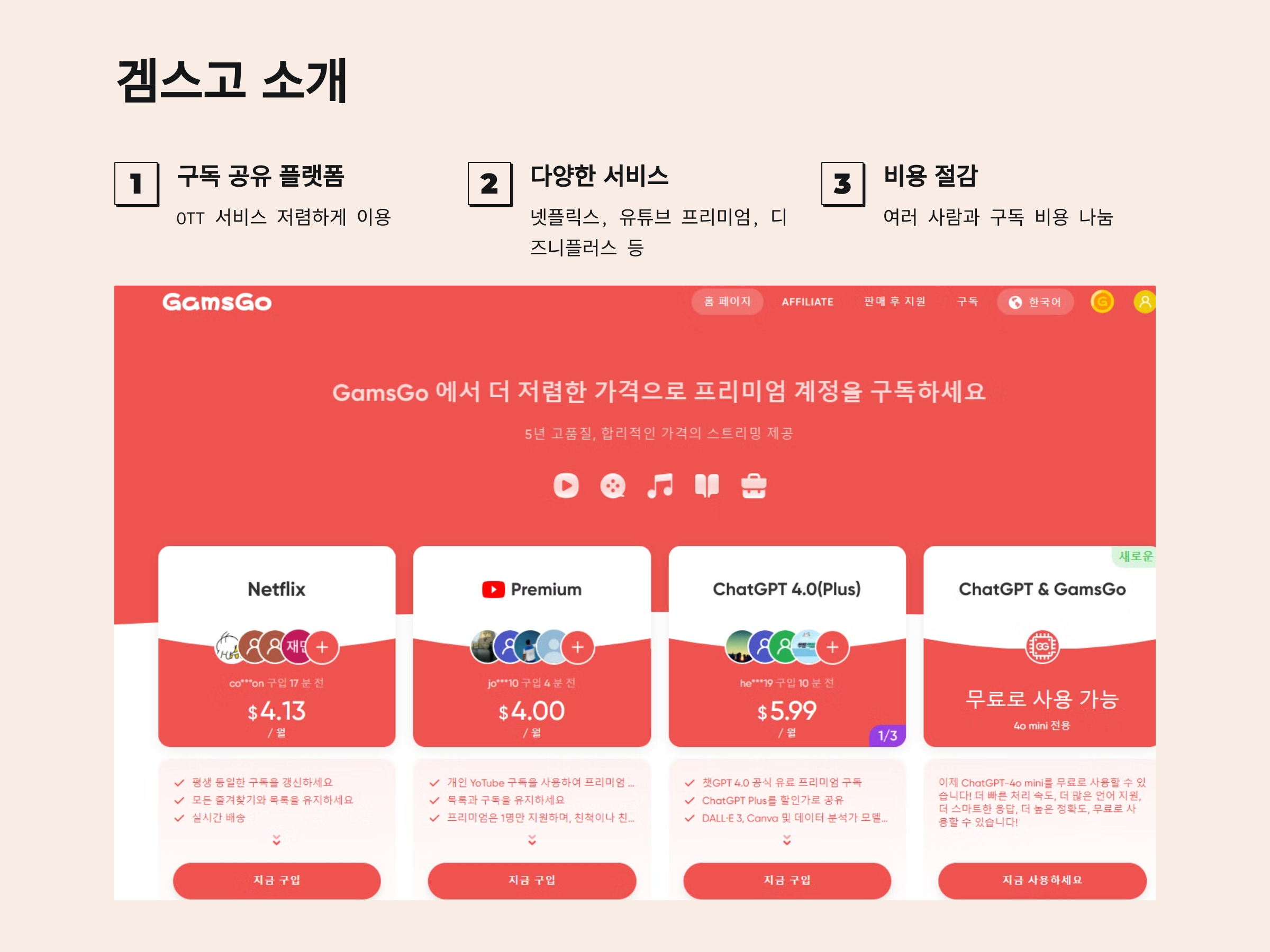 겜스고는 넷플릭스, 유튜브 프리미엄, 디즈니플러스 등 다양한 OTT 서비스를 저렴하게 이용할 수 있게 해주는 구독 공유 플랫폼입니다. 한 계정에 여러 명이 접속 가능한 서비스들을 여러 사람과 연결해 주어, 구독 비용을 나눠 내는 방식으로 운영됩니다.