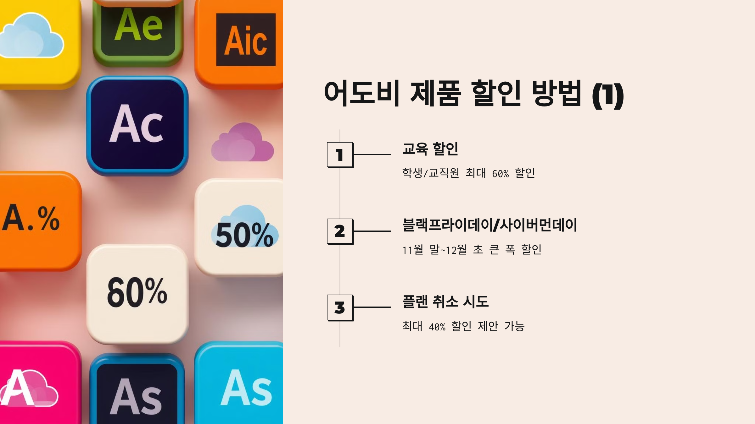 학생이나 교직원이라면 어도비 교육 할인을 받을 수 있습니다. 최대 60%까지 할인받을 수 있어 매우 경제적입니다.