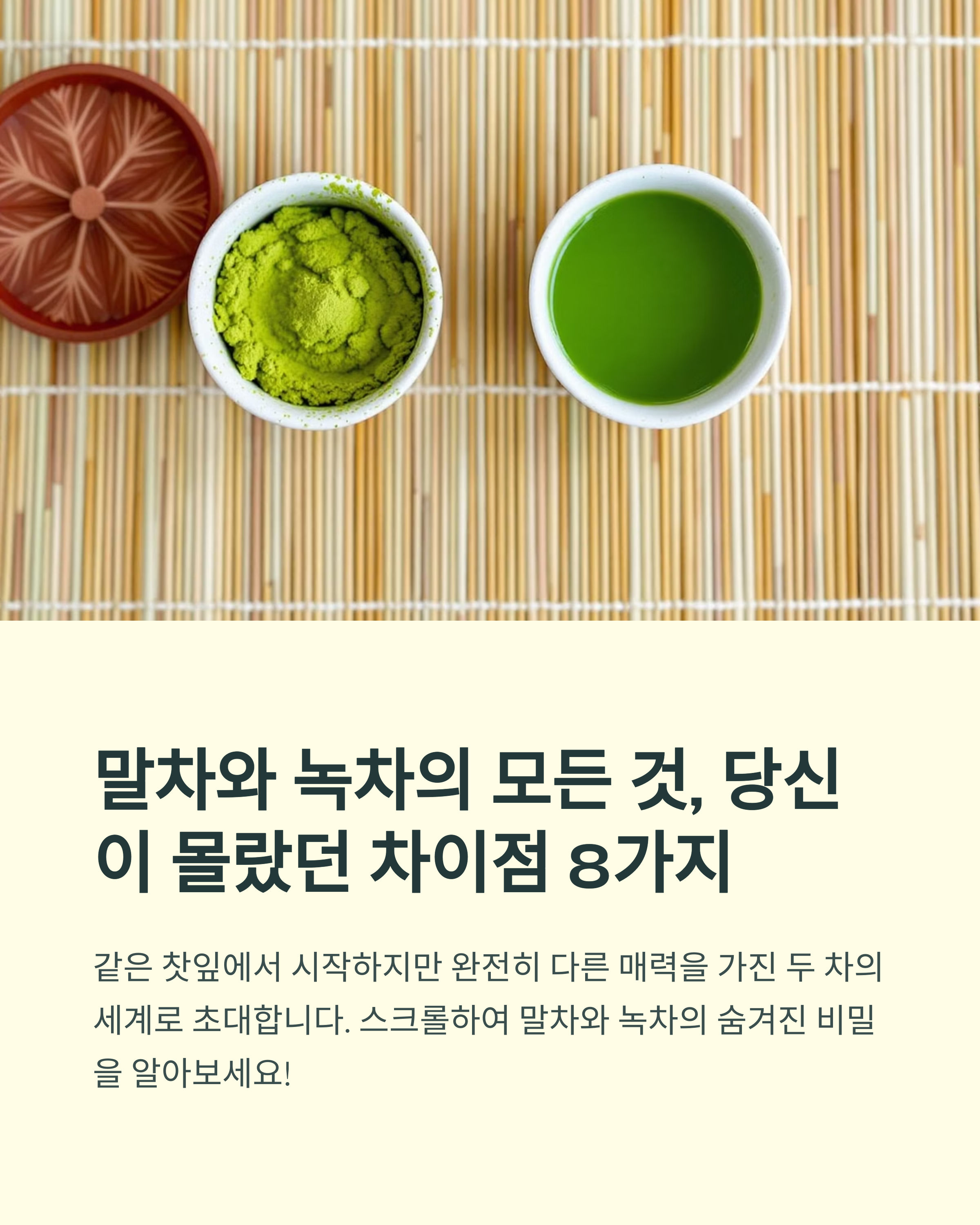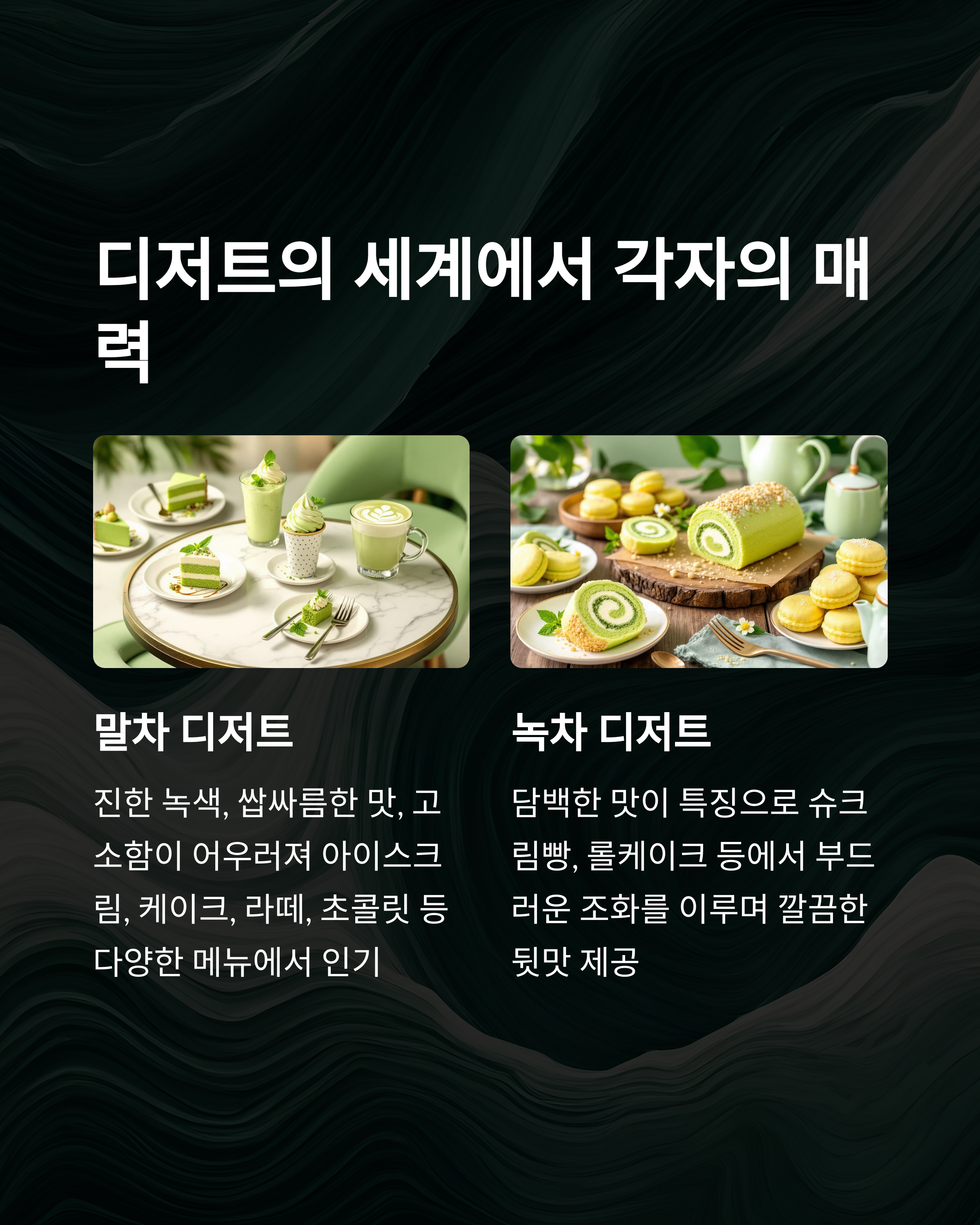 녹차와 말차, 같은 찻잎에서 시작하지만 완전히 다른 개성을 가진다. 디저트와 음료에서 각자의 매력이 뚜렷하니, 취향에 따라 골라 즐기는 재미가 있다. 두 가지 모두 건강에 좋은 차이니, 적당히 즐기면 일상에 작은 힐링이 된다.